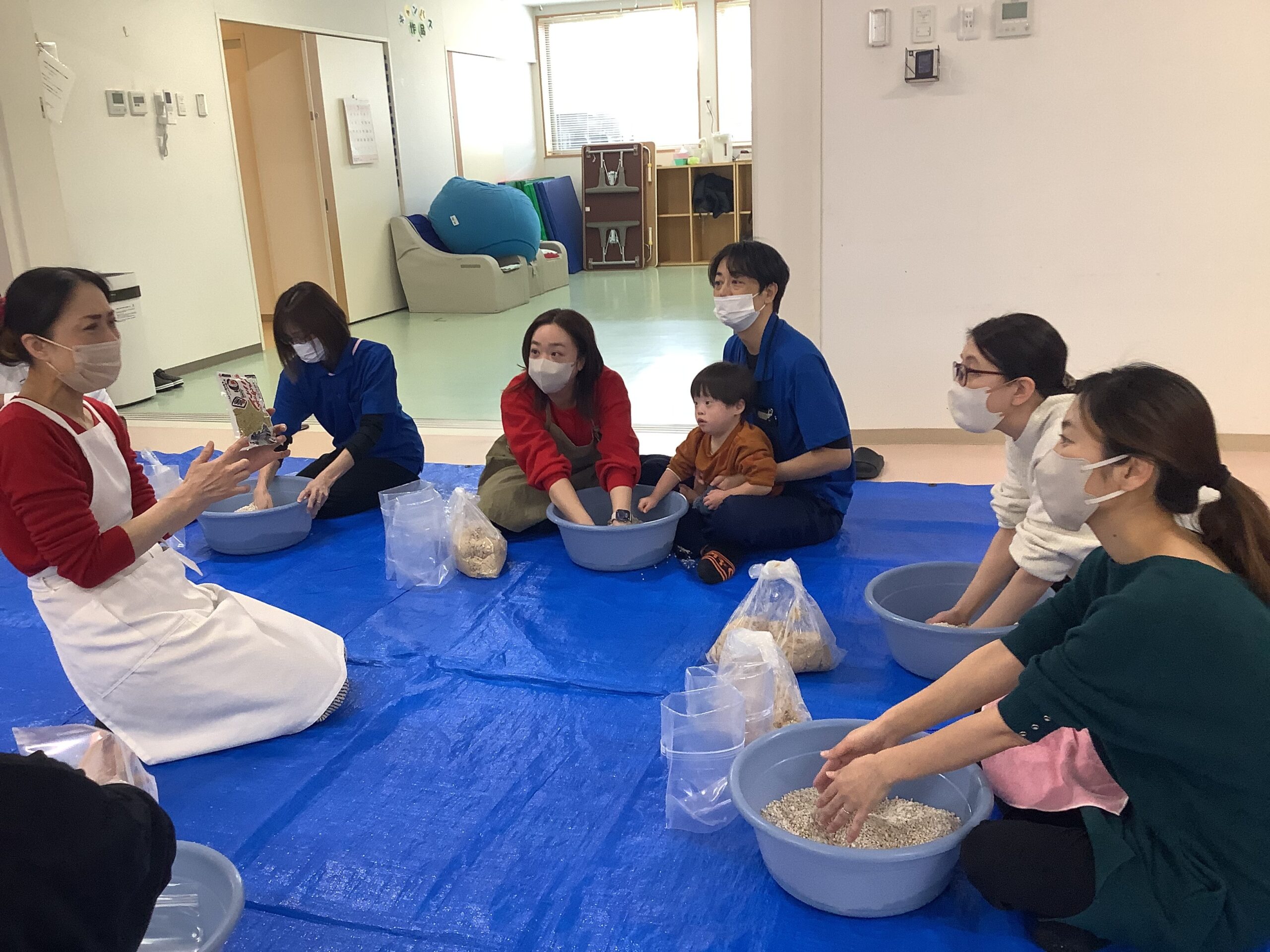 親子療育の一環として、地元の池田屋醸造さんから講師の先生をお招きし、施設内で本格的な味噌作りに挑戦しました。
